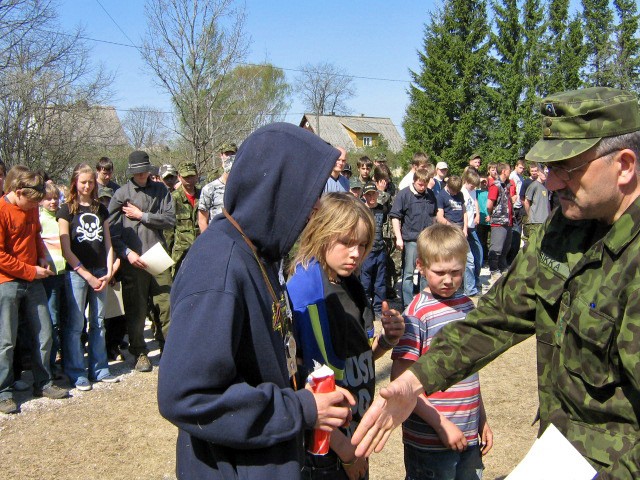 KL Harju Maleva noorkotkaste ja kodutütarde 2006. aasta Luureretke lõputseremoonia. Nissi malevkonna pealik leitnant Andres Sikka õnnitleb võitjaid.