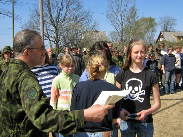 KL Harju Maleva noorkotkaste ja kodutütarde 2006. aasta Luureretke lõputseremoonia. Nissi malevkonna pealik leitnant Andres Sikka õnnitleb võitjaid.