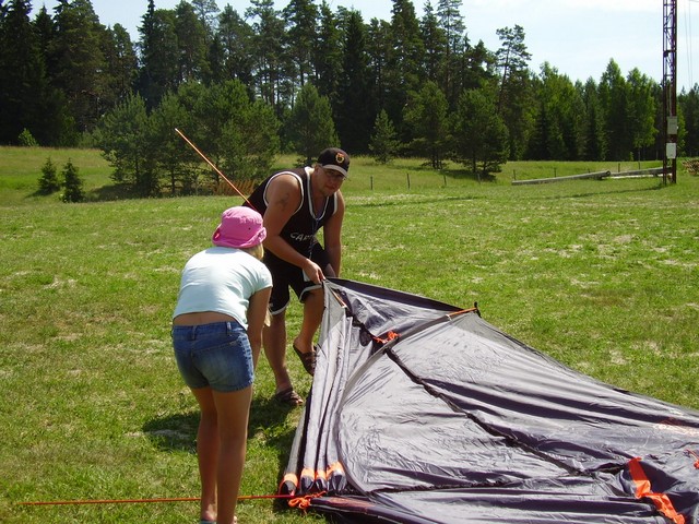 KL Harju maleva kodutütarde-noorkotkaste maakondlik suvelaager 2006. aasta suvel. Telki aitab püstitada Lauri Lasimir.