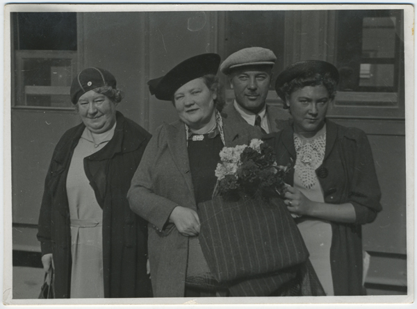 NKK Tallinna ringkonna esinaise Alma Jeetsi (keskel)vastuvõtmine Tallinna jaamas septembris 1938, (vasakult): NKK Tallinna ringkonna varustusosakonna vanem ja Ida jaoskonna esinane K. Münth ning Alma Jeets koos pereliikmetega.