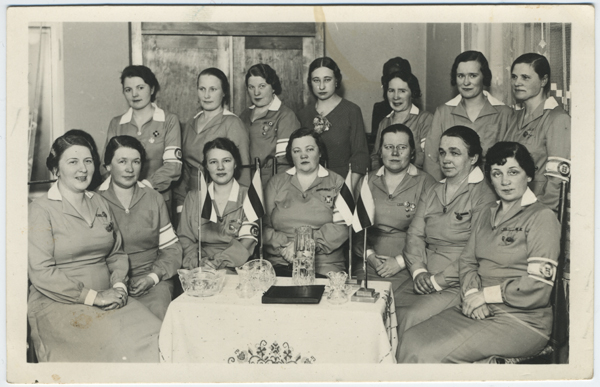 Foto 328_tln tagakülg. NKK Tallinna ringkonna korraldatud sanitaarkorjanduse nädala puhul auhindade kätteandmise tseremoonia 5. märtsil 1937. I auhinna võitis Lõuna jaoskond kui kõige töökaim jaoskond. Esireas vasakult esimene Lõunajaoskonna esinaine Gerda Kartus ja neljas NKK Tallinna ringkonna esinaine Alma Jeets.