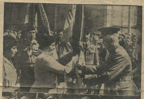 Ajaleheväljalõige: NKK Tallinna ringkonna esinaine Alma Jeets ulatab Noorte Kotkaste organisatsiooni 6. aastapäeval 1938. aastal NK peavanemale kindralleitnant Johan Laidonerile naiskodukaitsjate poolt annetatud lipu.