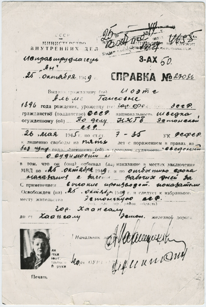 NKVD tõend 1949. aastast NKK Tallinna ringkonna esinaise Alma Jeetsi vabastamise kohta asumiselt Siberis ja luba elama asumiseks Haapsalu rajooni.