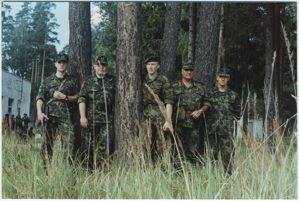 René Allik, Toomas Koort, Lahingukooli ülem leitnant Leo Kunnas, leitnant Einar Laigna ja Ragnar Koemets(?) või Rain Jano(?) Nursi või Sänna baasis 1990. aastate keskel.