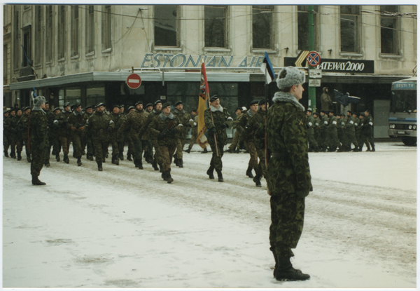 KL Tallinna maleva rühm, mida juhatab malevapealik nooremleitnant Hillar Tint Eesti Vabariigi aastapäeva paraadil 24. veebruaril 1994. aastal Vabaduse väljakul.