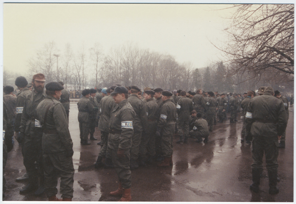KL Tallinna maleva kaitseliitlased Eesti Vabariigi aastapäeva paraadi proovil 1992. aastal Kadrioru staadioni juures: Hindrek Piiber, Ivar Kühn ja (taga kollase mütsiga) Vambola Lehe.