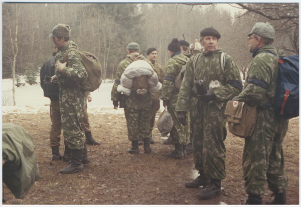 KL Tallinna maleva esimene sissilaager Tallinna lähedal Sookaeral märtsis 1992 (vasakult): Vambola Lehe, seljaga Hindrek Piiber, Gert Tramm, Siimu Sade, Vallo ???.