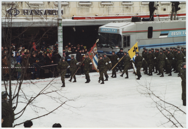 KL Tallinna maleva Lääne malevkonna rühm Eesti Vabariigi aastapäeva paraadil 24. veebruaril 2001: maleva lippur nooreseersant Andres Siim, lipusaaturid nooremseersant Raik Kuusemets ja Kaarel Kaas, rühma juhib lipnik Hannes Valk.