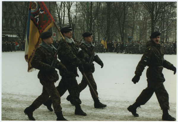 KL Tallinna maleva liputoimkond Eesti Vabariigi aastapäeva paraadil 24. veebruaril 1994: lippur Tiit Tombak, lipusaaturid René ja Sten Allik, rühma juhib malevapealik nooremleitnant Hillar Tint.