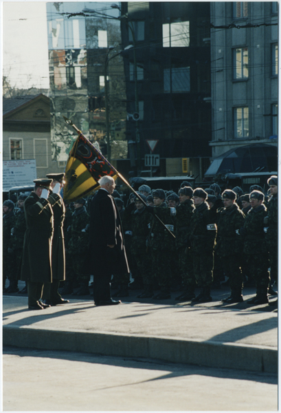 KL Tallinna maleva rühm Eesti Vabariigi aastapäeva paraadil 24. veebruaril 1996: president Lennart Meri tervitab KL Tallinna maleva esindust.