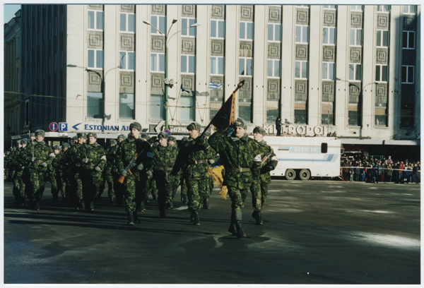 KL Tallinna maleva rühm Eesti Vabariigi aastapäeva paraadil 24. veebruaril 1995: üksust juhib KL Tallina maleva pealik leitnant Mart Puusepp.