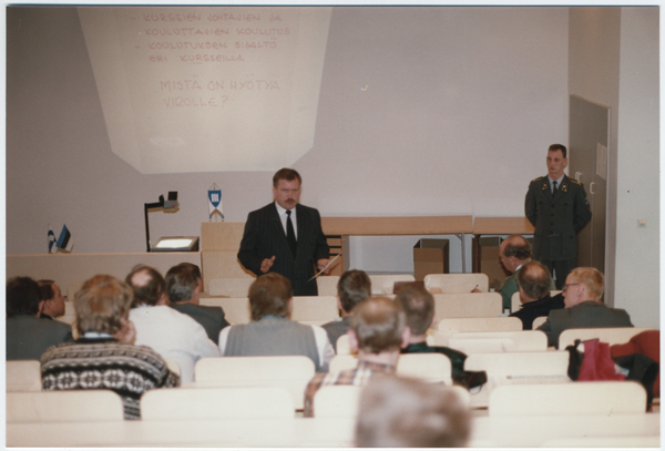 Kaitseliidu ülem major Johannes Kert ja 40 KL esindajat külaskäigul Soomes Helsingi Õhutõrjerügemendis (Ilmantorjuntarykmennti) Hyryläs 22.-24. aprillil 1994. KL ülem major Johannes Kert peab ettekannet.