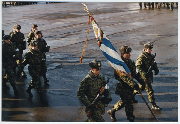 KL Tallinna maleva liputoimkond Eesti Vabariigi aastapäeva paraadil 24. veebruaril ????: lippur nooremseersant Andres Siim, liputoimkonnas Raik Kuusemets ja Meelis Oidsalu, rühma juhib Andres Männart.