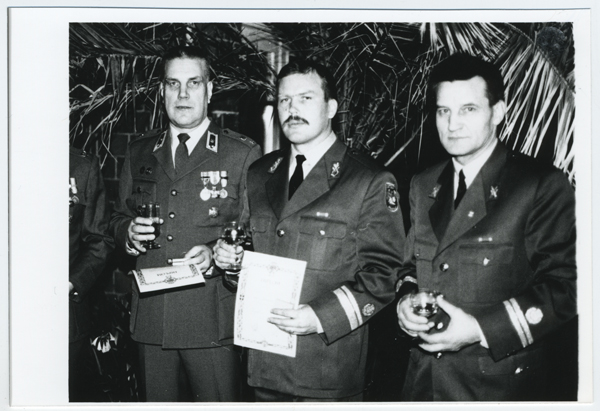 KL aastapäeva tähistamine Lillepaviljonis 1993. aasta novembris: major Esa Pajunen, KL ülem major Johannes Kert ja KL Tallinna maleva pealik nooremleitnant Mart Puusepp.