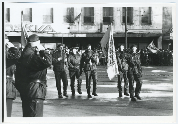 Esimene Eesti kaitseväe paraad taasiseseisvunud Eestis 24. veebruaril 1992. (Prantsuse vormid) Kõige parempoolsem Aigar Lipping KL Võrumaa malevast.