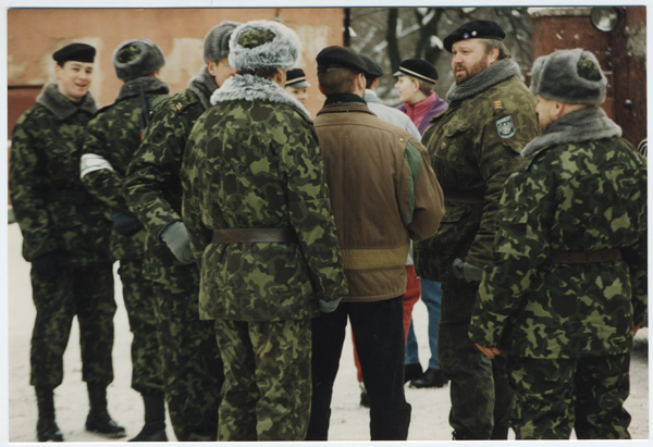 KL Tallinna maleva vana staabi (aadress Narva mnt 77) hoovil (vasakult): Kristian Pärt, vanemseersant Peeter Saadla. 1990. aastate keskapaik.