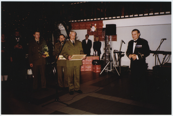 KL Tallinna maleva 76. aastapäeva tähistamine Lillepaviljonis 2001. aasta aanuari algul. Leedu KASP esindajad kingitust üle andmas malevapealik kapten Mart Puusepale.