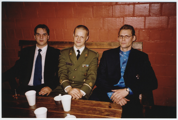KL Tallinna maleva 76. aastapäeva tähistamine Lillepaviljonis 2001. aasta jaanuari algul, vasakult: Jukka I. Mattila, kapten Margus Rebane ja Matti Luomansuu (Ojasilta).