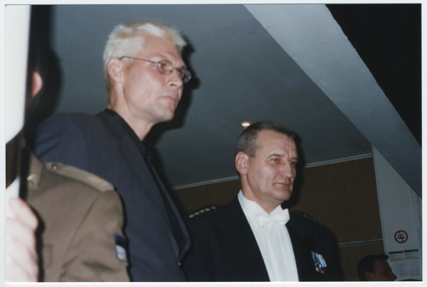 KL Tallinna maleva aastapäev Lillepaviljonis jaanuari algul 1999. aastal: Soome instruktor Matti Luomansuu (Ojasilta) ja KL Tallinna maleva pealik kapten Mart Puusepp.