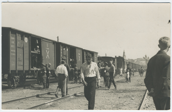 KL Petseri maleva kaitseliitlased KL päeval Tallinnas 1935. aastal, vagunid lahkumas Kopli jaamast.